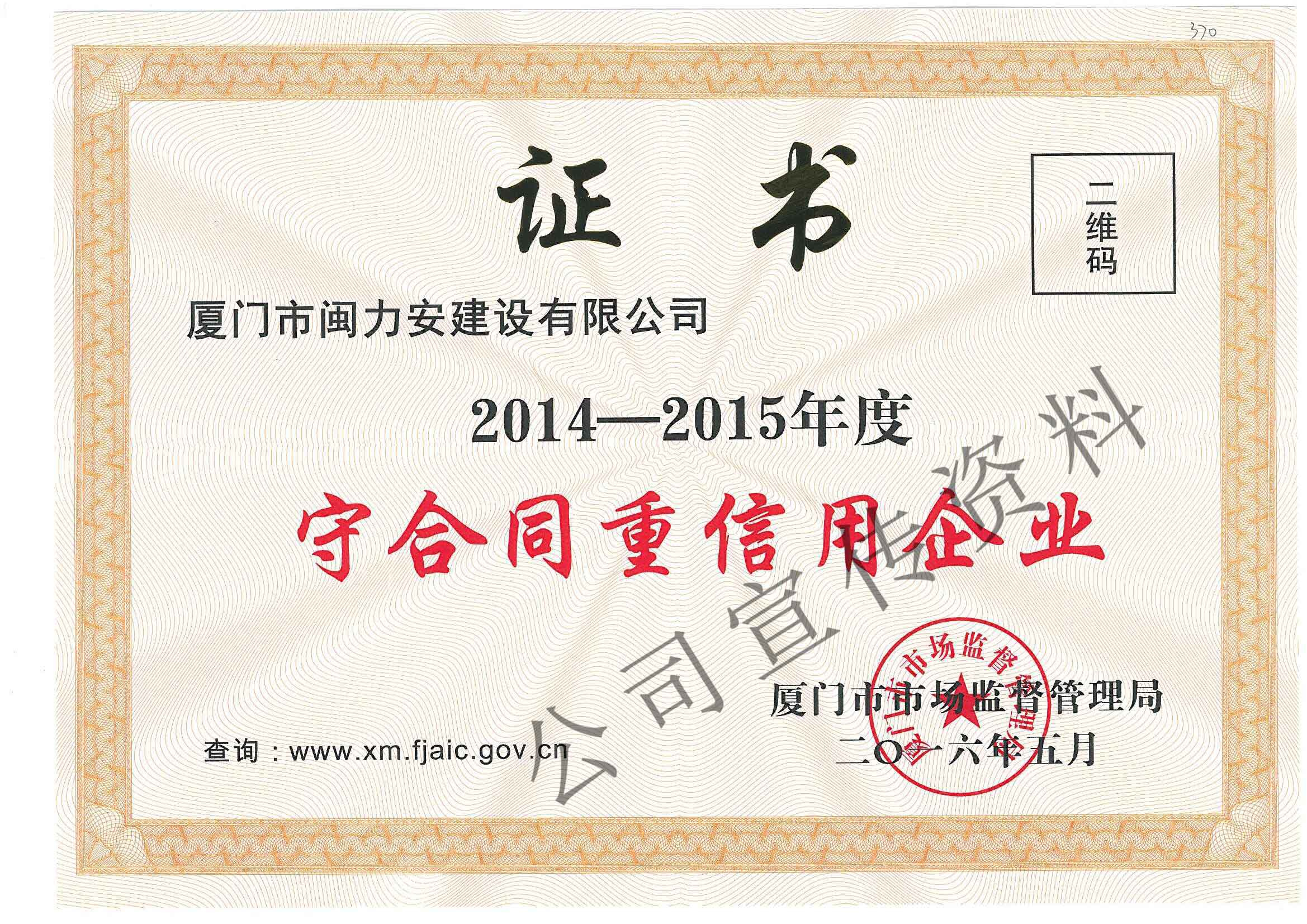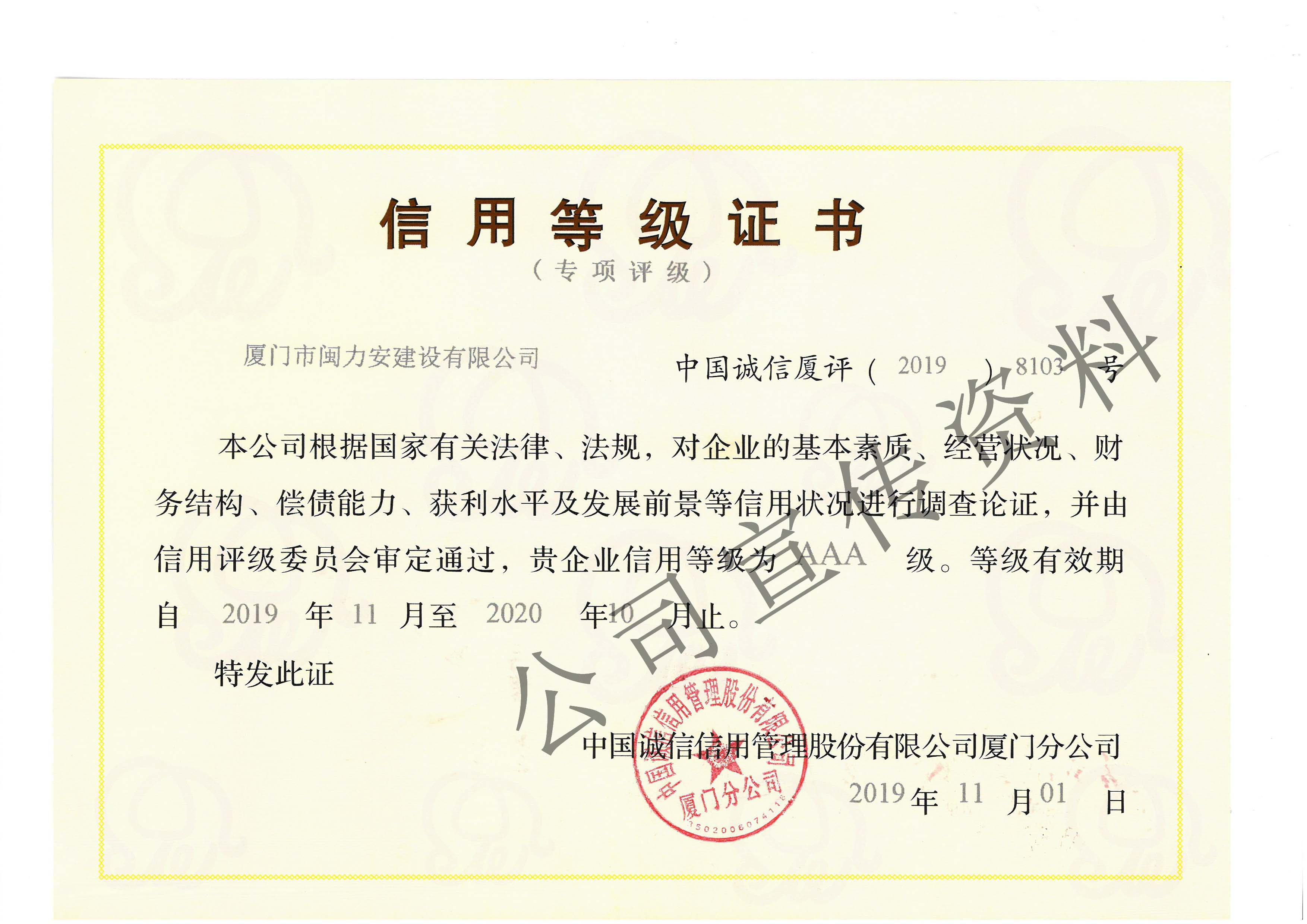 廈門市閩力安建設(shè)有限公司成立于2003年,公司取得市政公用工程施工總承包貳級(jí)、建筑裝修裝飾工程專業(yè)承包壹級(jí)、城市及道路照明工程專業(yè)承包壹級(jí)、電子與智能化工程專業(yè)承包貳級(jí)、消防設(shè)施工程專業(yè)承包貳級(jí)、電力工程施工總承包叁級(jí)、建筑機(jī)電安裝工程專業(yè)承包叁級(jí)、輸變電工程專業(yè)承包叁級(jí)、環(huán)保工程專業(yè)承包叁級(jí)、照明工程設(shè)計(jì)專項(xiàng)甲級(jí)、建筑裝飾工程設(shè)計(jì)乙級(jí)、施工勞務(wù)等資質(zhì)的綜合型企業(yè),公司于2013年通過(guò)了ISO9001質(zhì)量體系認(rèn)證,ISO14001環(huán)境管理體系認(rèn)證,OHSAS18001職業(yè)健康安全管理體系認(rèn)證。